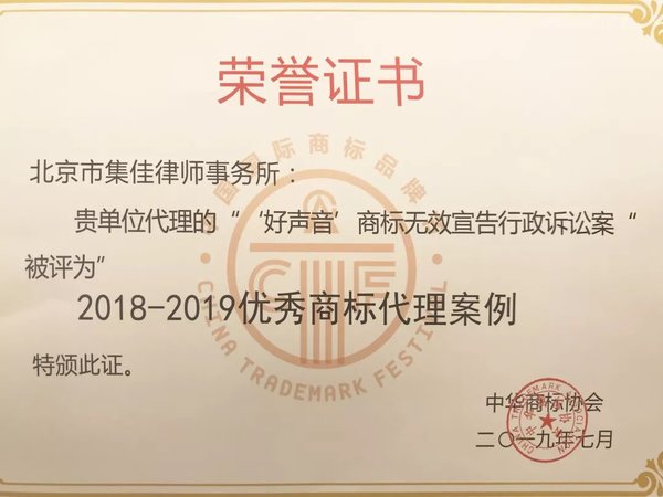 >壹号娱乐>关于我们>荣誉概览>2019>集佳代理“好声音”商标无效宣告行政案入选“优秀商标代理案例”