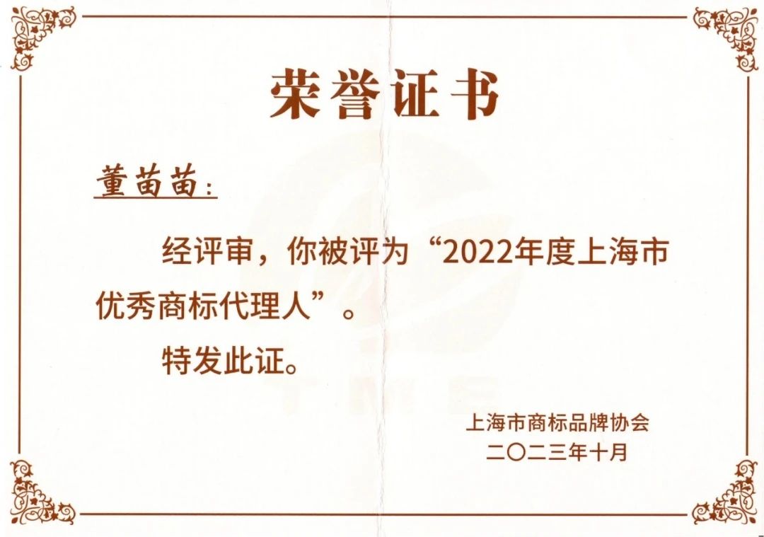 集佳上海分所董苗苗律师被评为2022年度“上海市优秀商标代理人”