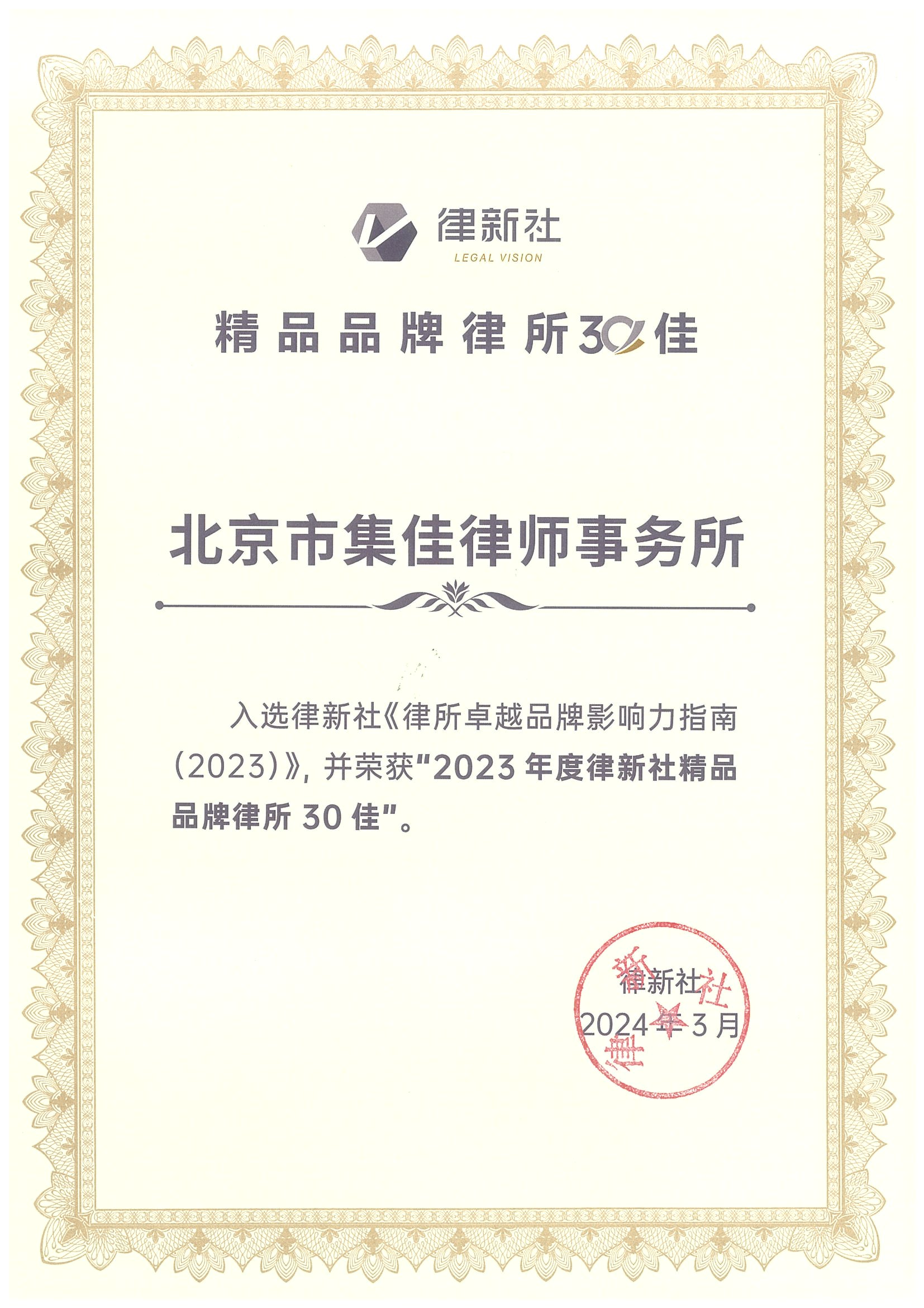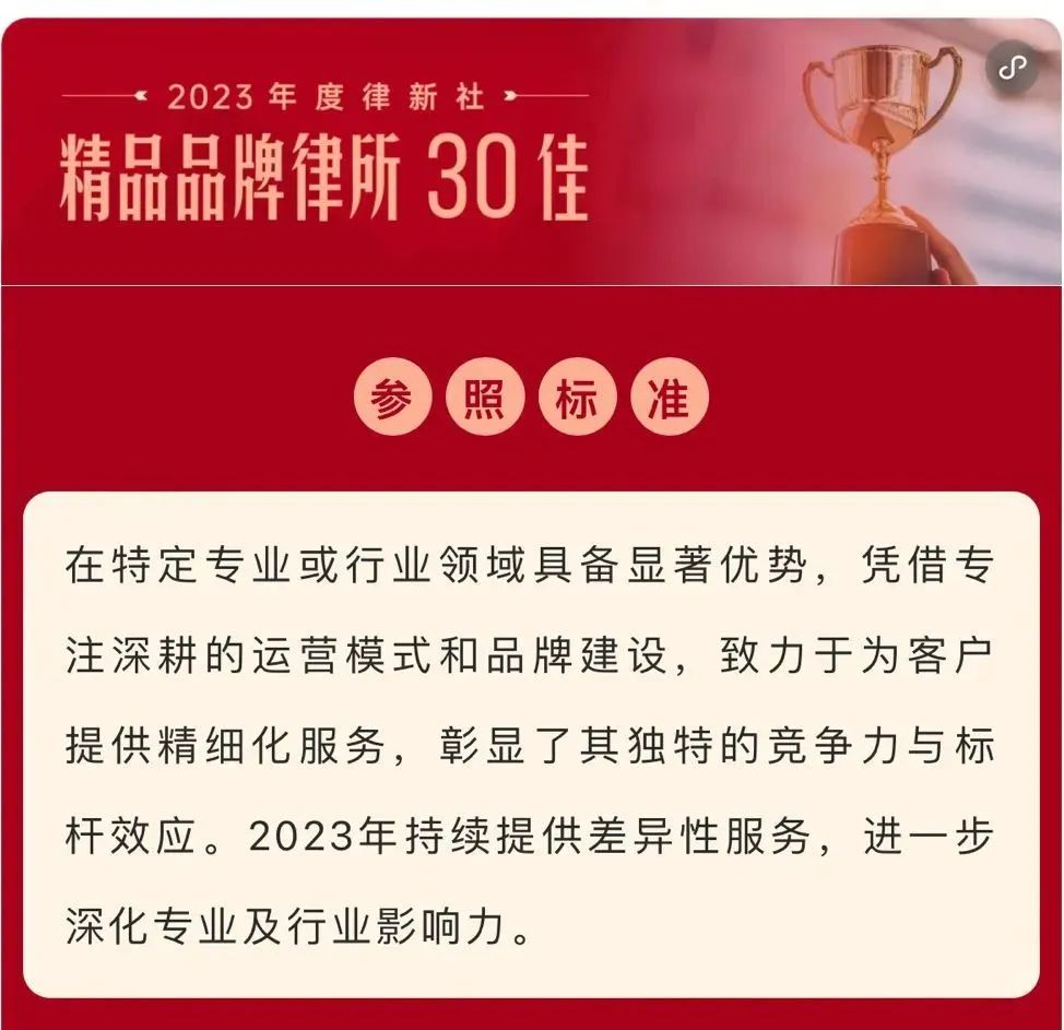 2024年3月2日,由中国法学交流基金会指导、律新社主办的“致·追光者”第二届法律服务业品牌发展论坛暨律新社2023年度品牌盛典隆重举行,现场发布了备受关注的《律所卓越品牌影响力指南(2023)》,壹号娱乐凭借在知识产权领域的卓越实力和良好口碑,荣登“2023年度律新社精品品牌律所30佳”榜单。